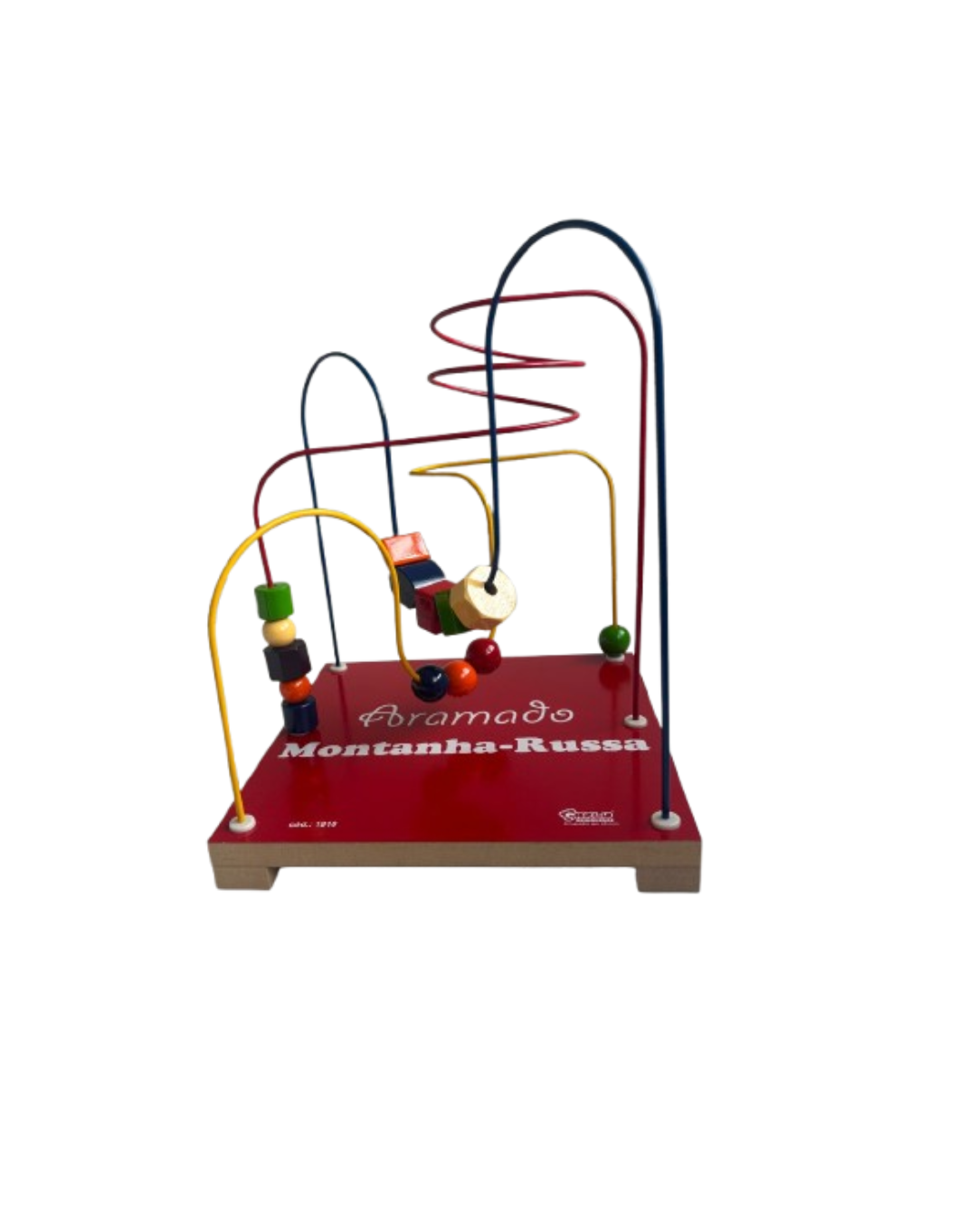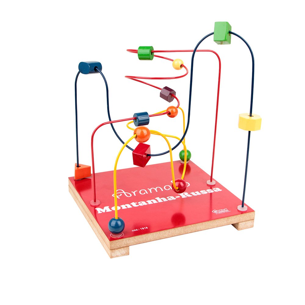 Descritivo detalhado: Brinquedo confeccionado em madeira, M.D.F. e arame. Composto por 03 circuitos e 14 peças de formas variadas e coloridas. Arames resistentes e pintados com tinta atóxica. Base e peças pintadas com tinta atóxica colorida.