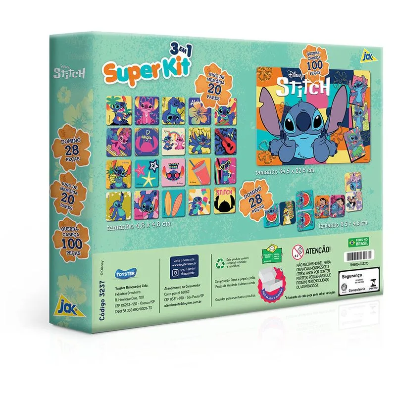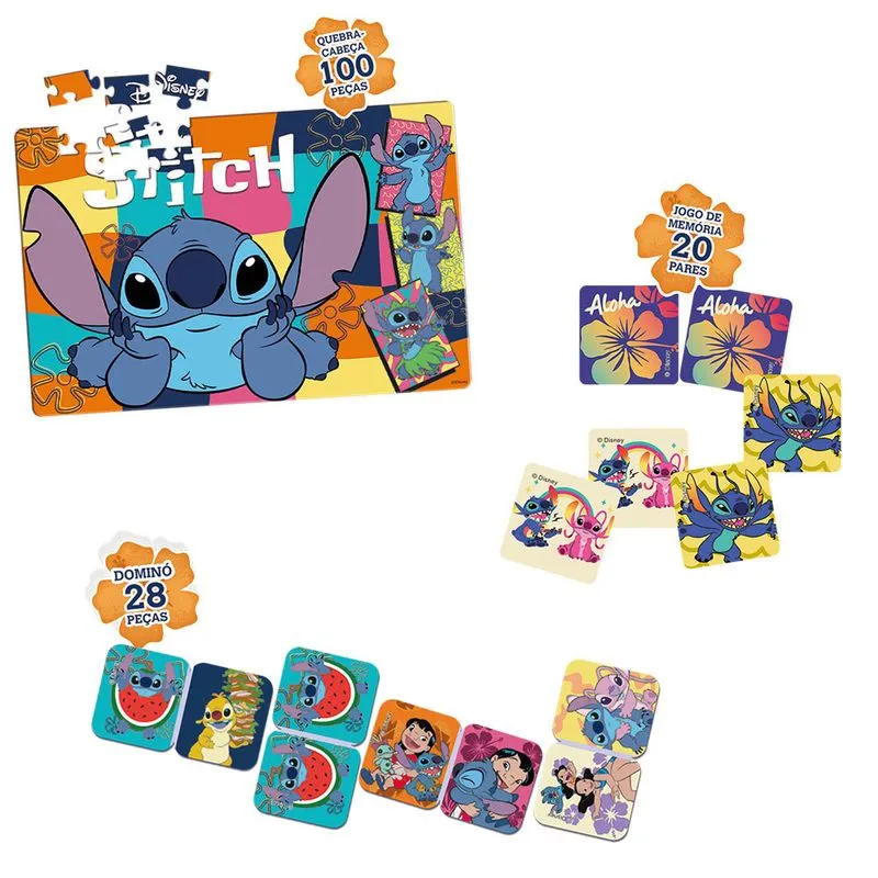 Super Kit 3 em 1 do Stitch contempla 1 Quebra-cabeça,1 dominó e 1 jogo de memória do Stitch! Estimula habilidades cognitivas, motoras e sociais.